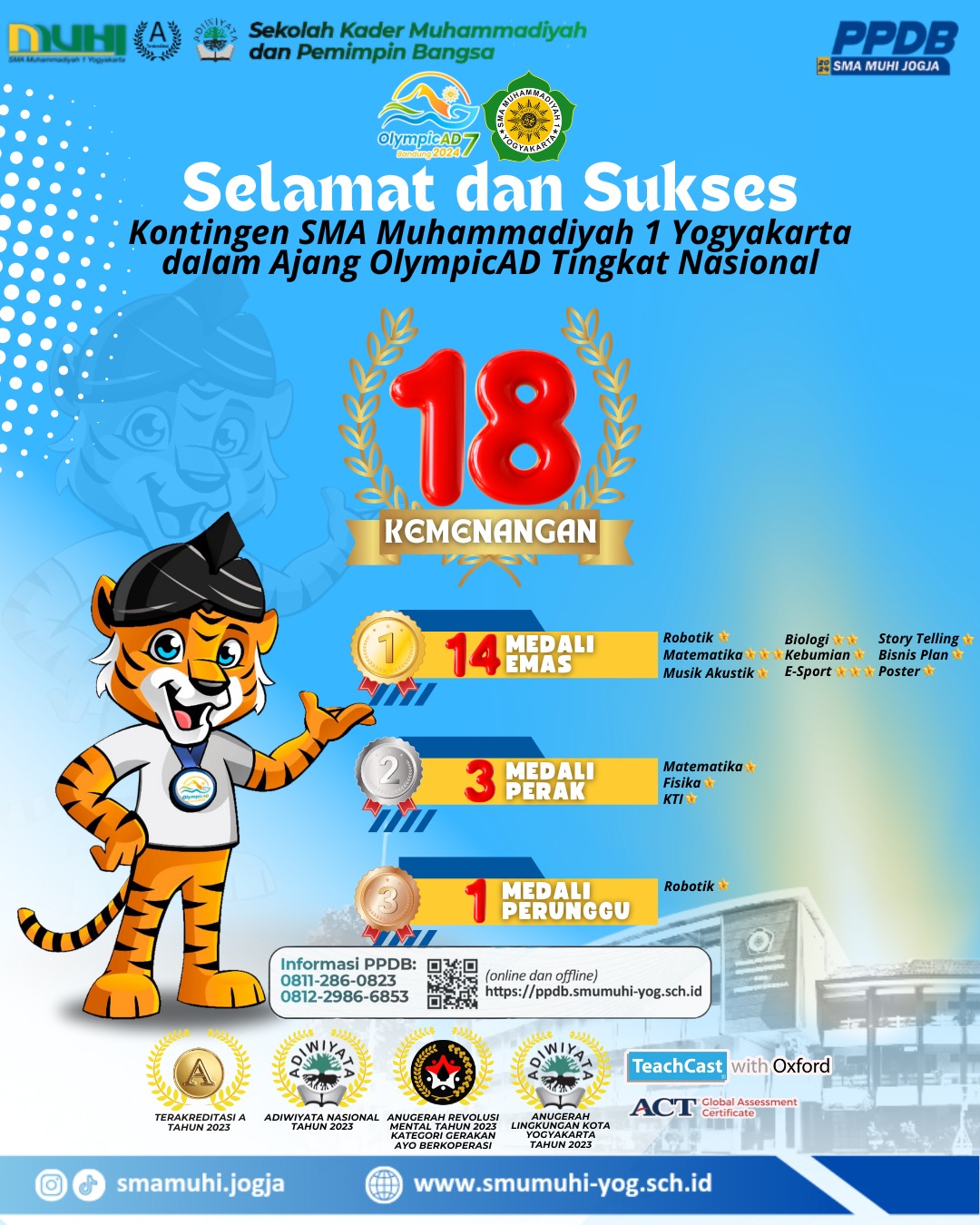 SMA Muhammadiyah 1 Yogyakarta berhasil meraih 14 medali emas, 3 medali perak, dan 1 medali perunggu dalam ajang ini. Raihan medali ini menjadikan SMA Muhammadiyah 1 Yogyakarta sebagai peraih medali terbanyak dan juara umum tingkat sekolah Muhammadiyah se-Provinsi DIY.