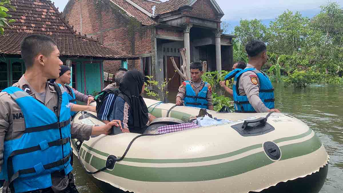 Demak, doreng45.com – Ratusan personel Polres Demak menggunakan perahu karet mengevakuasi warga yang terkena banjir di Kabupaten Demak, Jawa Tengah. Ribuan rumah terdampak banjir akibat hujan yang terus mengguyur wilayah Demak.