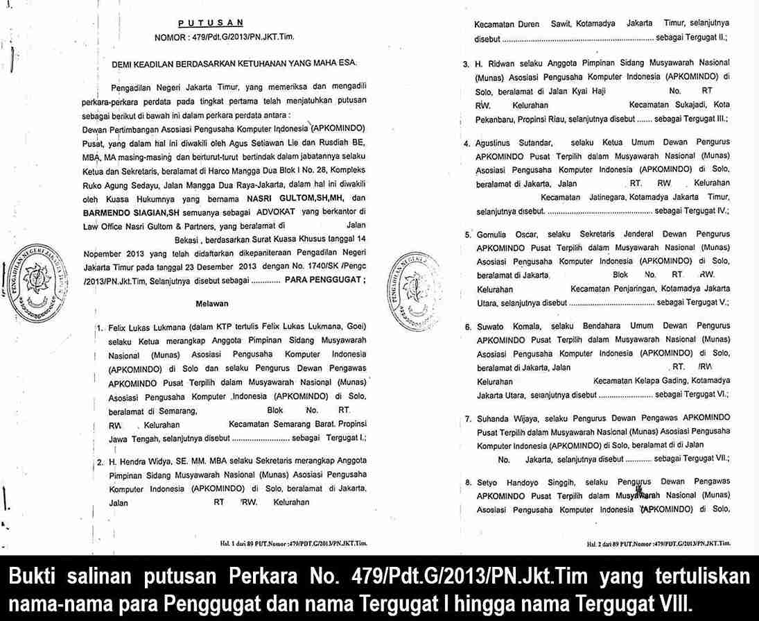 Menurut Hoky, perkara tersebut bermula dari gugatan DPA APKOMINDO yang diajukan sejak 23 Desember 2013 oleh Agus Setiawan Lie dan Rusdiah BE, MBA, MA. Gugatan tersebut kemudian diputus oleh PN JakTim pada 4 Mei 2015 dengan amar putusan: gugatan tidak dapat diterima.
