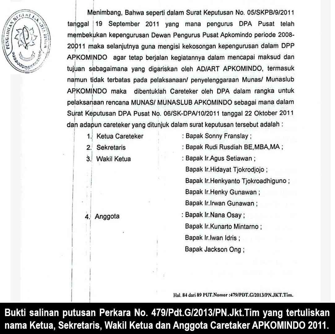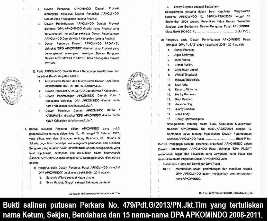 Kasasi ini juga membuka kembali fakta-fakta lama yang terungkap dalam salinan putusan No. 479/PDT.G/2013/PN.JKT.TIM. Salah satunya adalah pembekuan pengurus DPP APKOMINDO periode 2008–2011 secara sepihak oleh DPA APKOMINDO, termasuk Suhanda Wijaya (Ketum), Setyo Handoyo Singgih (Sekjen), dan Thedy Suyanto (Bendahara).