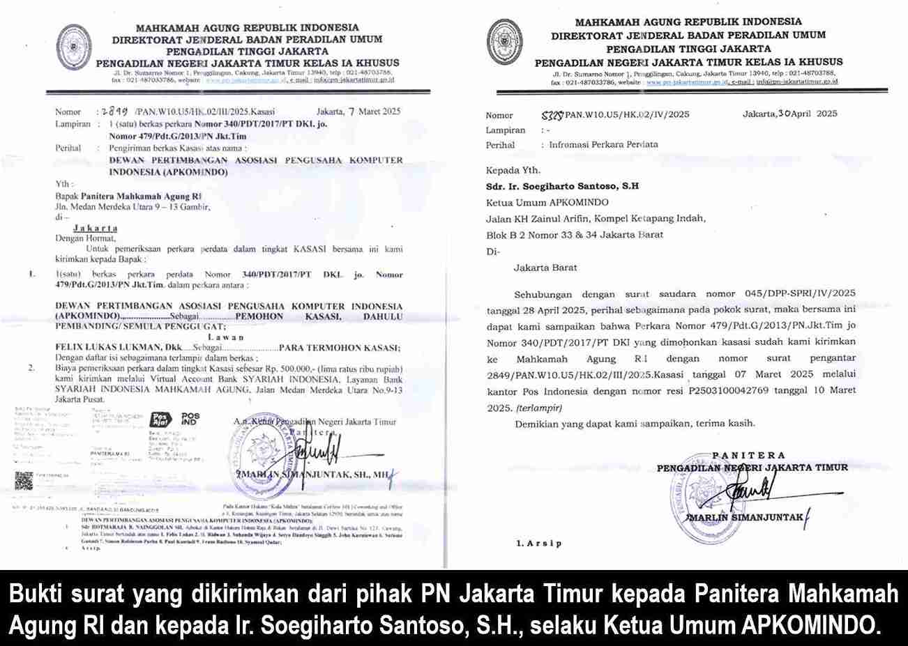 Ketua Umum APKOMINDO, Ir. Soegiharto Santoso, SH, menyampaikan hal ini berdasarkan surat pemberitahuan dari PN JakTim dengan Nomor: 5325/PAN.W10.U5/HK.02/IV/2025, tertanggal 30 April 2025. Dalam surat tersebut dijelaskan bahwa perkara No. 479/Pdt.G/2013/PN.Jkt.Tim jo No. 340/PDT/2017/PT DKI yang dimohonkan kasasi oleh pihak Dewan Pertimbangan Asosiasi APKOMINDO (DPA APKOMINDO) telah dikirimkan ke MA melalui Pos Indonesia dengan resi P2503100042769.