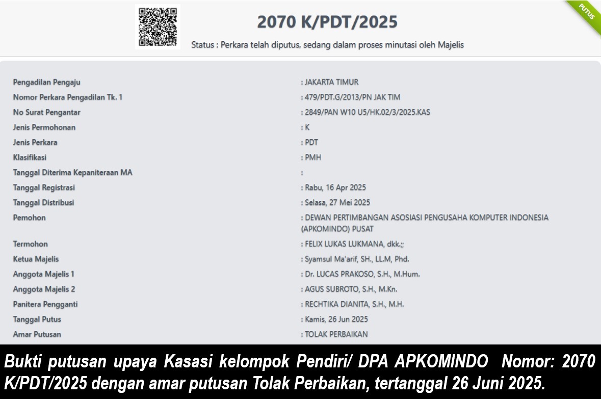Penolakan kasasi ini dikonfirmasi Ketua Umum APKOMINDO, Ir. Soegiharto Santoso, SH. atau Hoky, usai mendapatkan informasi resmi dari laman kepaniteraan MA. Putusan Kasasi Nomor 2070 K/PDT/2025 dengan amar “TOLAK PERBAIKAN” ditetapkan Majelis Hakim yang diketuai Syamsul Ma’arif, SH., LLM., PhD., bersama anggota Dr. Lucas Prakoso, SH., MHum., dan Agus Subroto, SH., MKn., serta Panitera Rechtika Dianita, SH., MH., pada 26 Juni 2025.