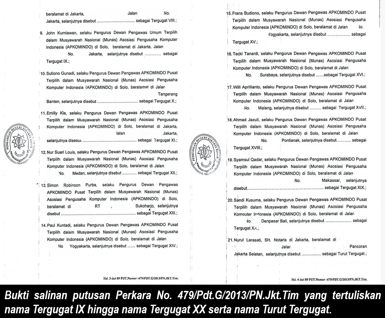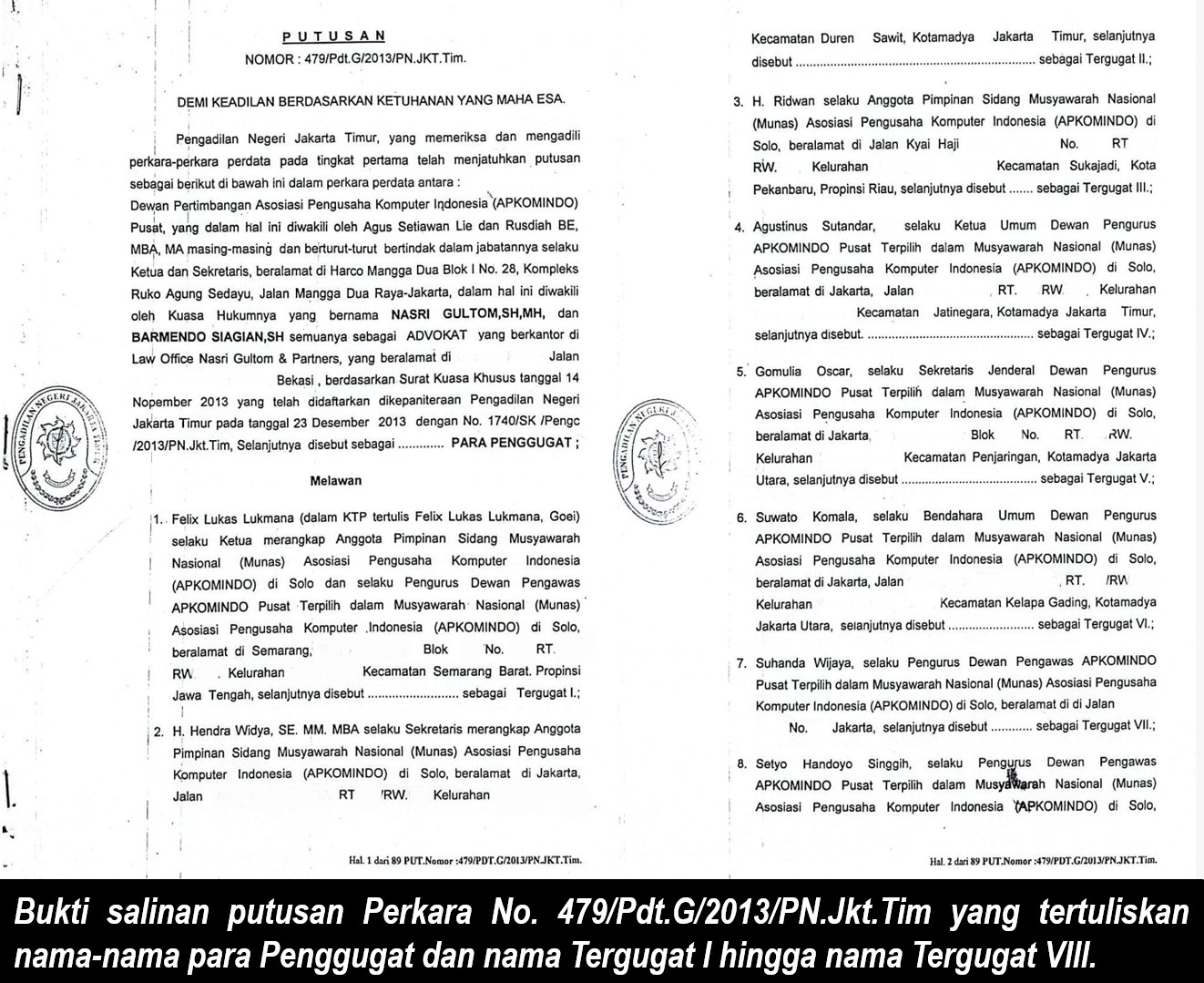 Tergugat dalam perkara ini berjumlah 20 orang, termasuk Felix Lukas Lukmana, Suhanda Wijaya, Nurul Larasati, hingga Sandy Kusuma. Amar putusan pada 4 Mei 2015 menyatakan bahwa gugatan tidak dapat diterima. Upaya banding pun gagal memperbaiki hasil tersebut.