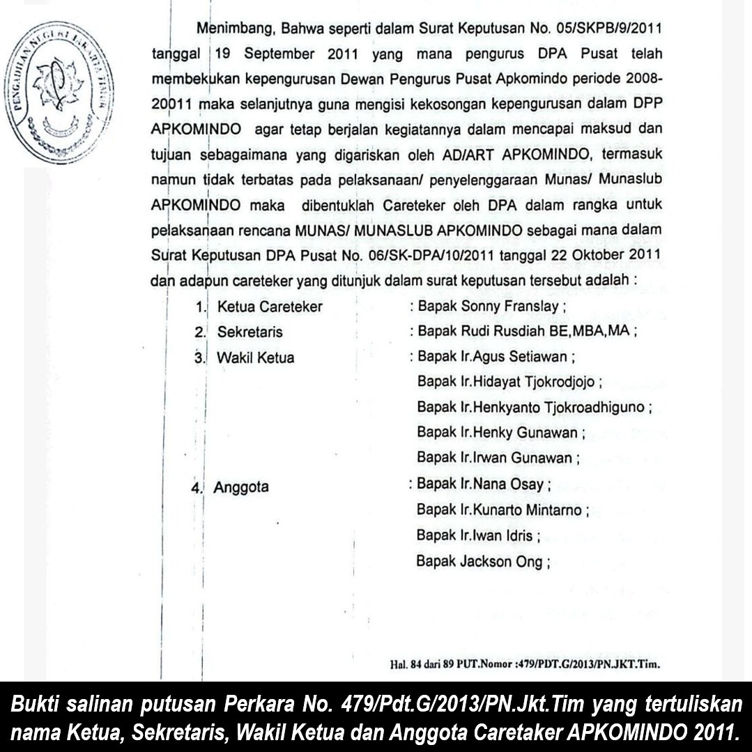 Lebih lanjut, upaya kasasi ini juga membuka kembali konflik internal APKOMINDO sejak 2011, dimulai dari pembekuan pengurus DPP oleh DPA masa bakti 2008-2011. Mereka membentuk tim caretaker yang tidak berhasil melaksanakan MUNAS/MUNASLUB dan malah kembali mengajukan gugatan hukum yang berujung gagal total.