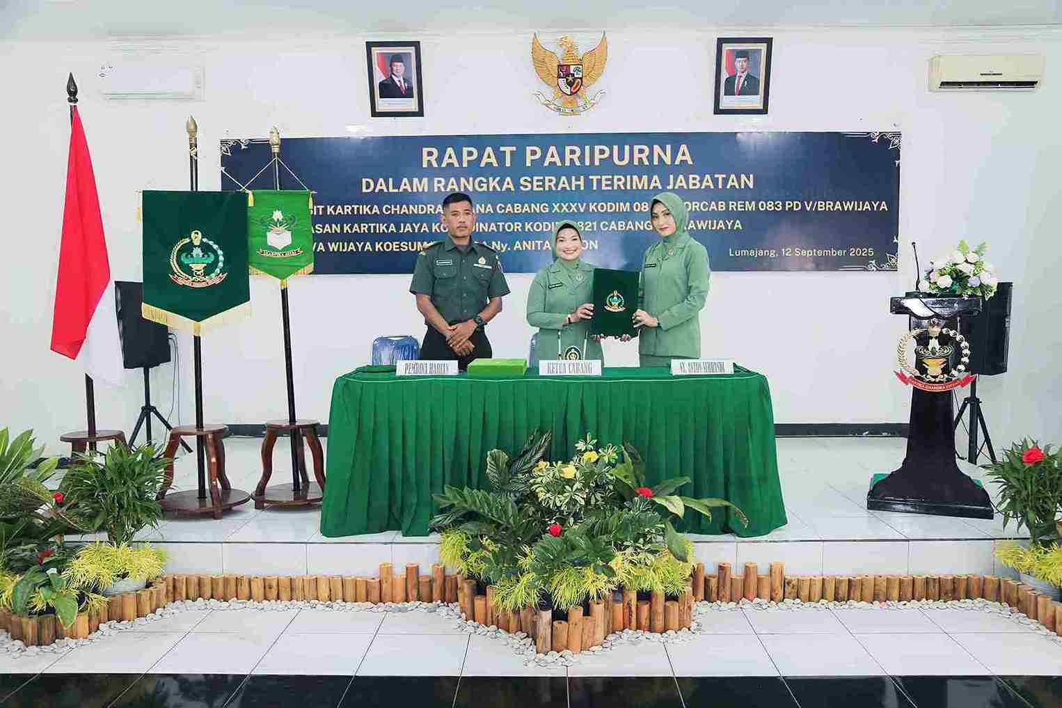 Lumajang, Doreng45.com – Persit Kartika Chandra Kirana (KCK) Cabang XXXV Dim 0821 Lumajang melaksanakan acara serah terima jabatan Ketua Persit dari Ny. Nova Wijaya Koesuma kepada Ketua baru, Ny. Anita Anton. Kegiatan berlangsung khidmat di Aula Raden Wijaya Makodim 0821 Lumajang, Jumat (12/9/2025).