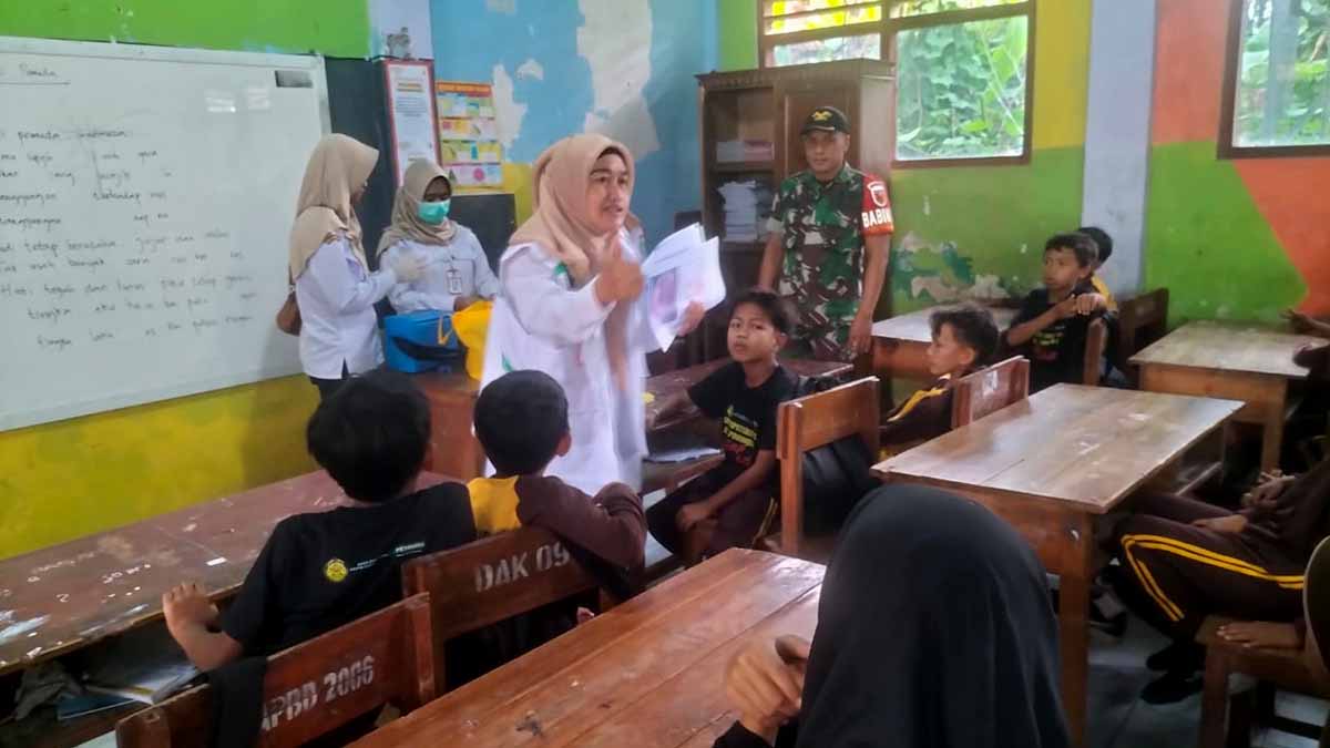Bidan Desa Supiturang memberikan penjelasan tentang pentingnya imunisasi dan pemberian obat cacing kepada siswa SDN Supiturang 04, dengan pendampingan Babinsa Koramil 0821-14/Pronojiwo. (Foto: Toeloes, S.H.)
